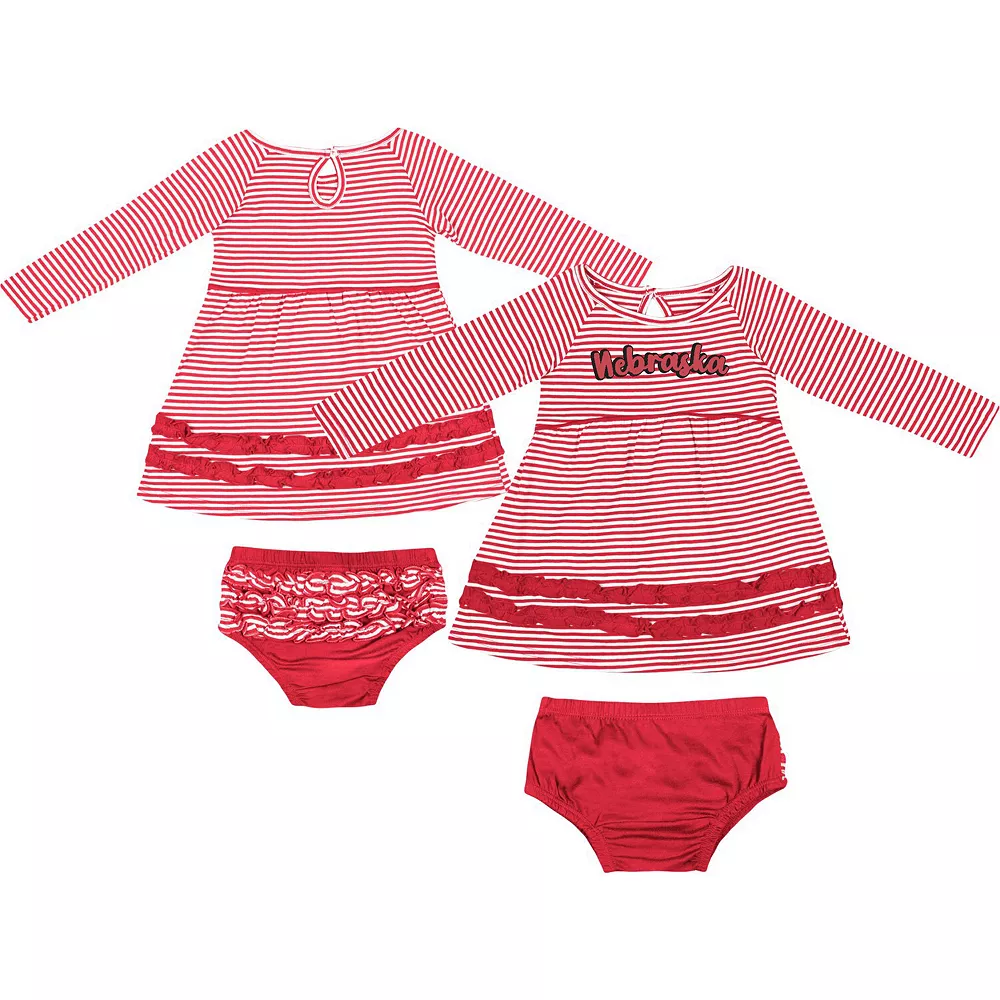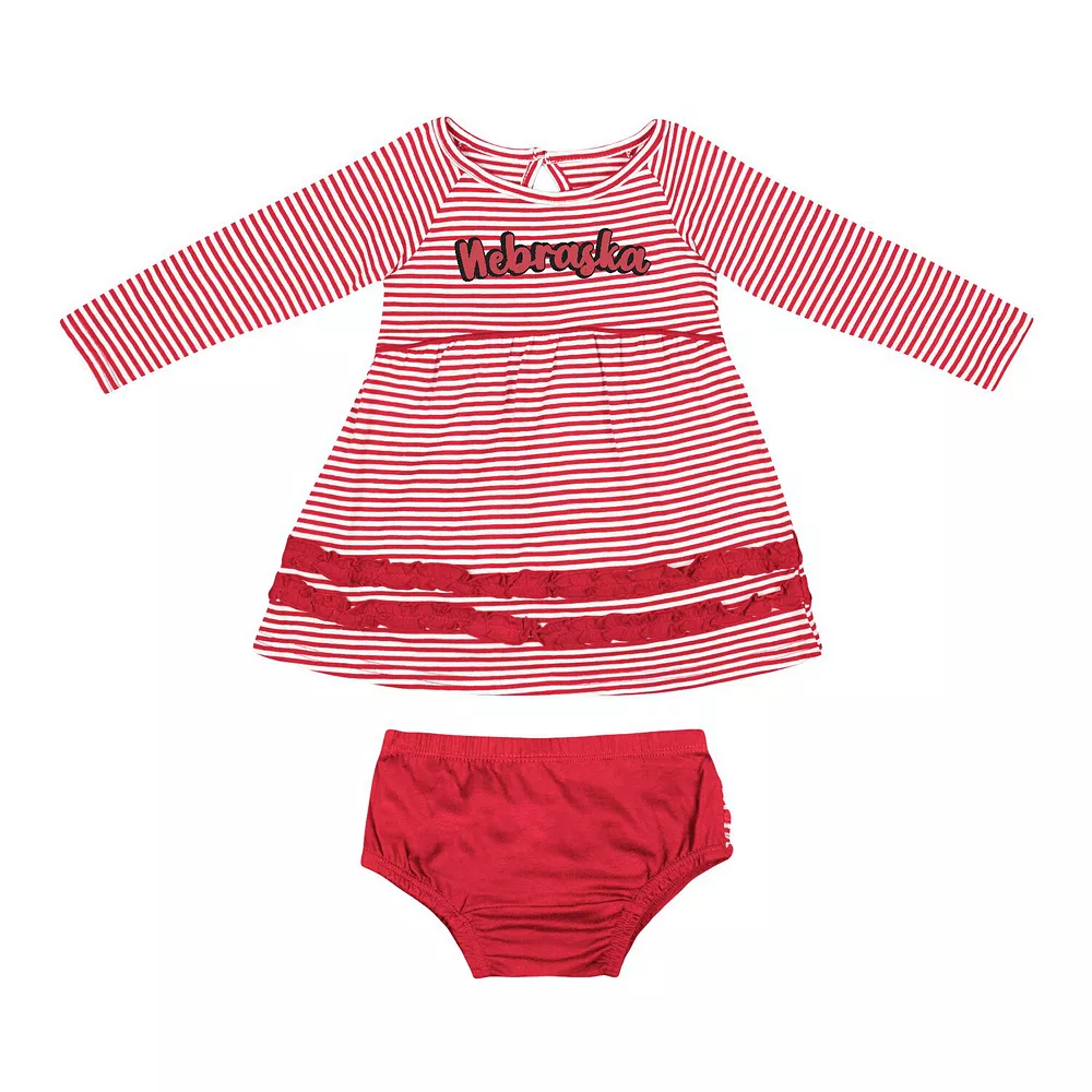 For a charming display of Nebraska Huskers spirit, grab your little one this Whoville set from Colosseum. It includes a dress with script Nebraska Huskers graphics and bloomers with cute ruffles. Eye-catching stripes add an adorable touch.