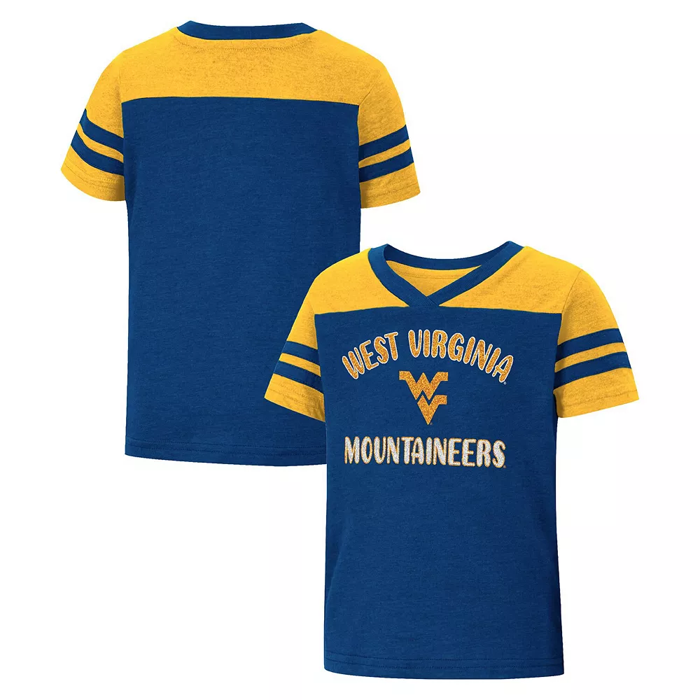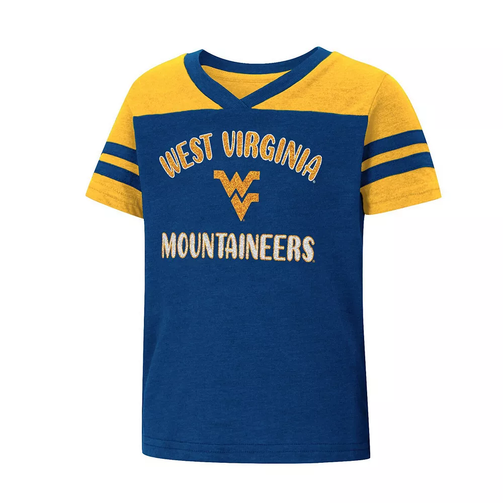 Gift your favorite West Virginia Mountaineers fan this adorable Colosseum Piecrust Promise V-neck T-shirt. It features West Virginia Mountaineers graphics with glitter details and stripes for a charming look. Soft fabric provides all-day comfort for your little one.