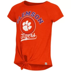 Give your young fan the perfect way to stand out on game day with this Salt Tie-Front T-shirt by Colosseum. Between its vintage-style Clemson Tigers graphics and solid team color, this tee will help their fandom will shine through. Raglan sleeves grant them a greater range of motion, so they can cheer for the Clemson Tigers more wildly than ever.