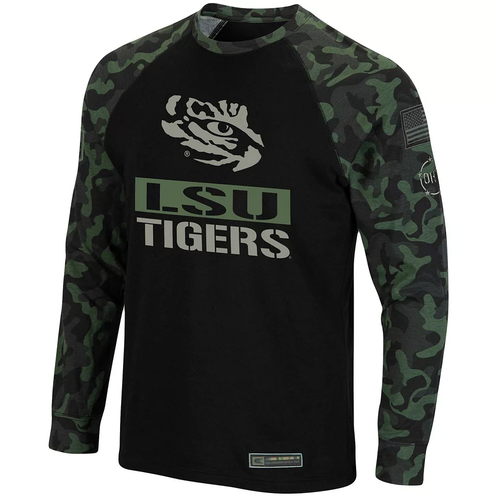 Show support for your LSU Tigers in a patriotic manner by wearing this OHT Military Appreciation T-shirt from Colosseum. It features athletic-style raglan sleeves with a sublimated camo pattern and color-coordinated American flag. The team name and logo let everybody know for sure that your allegiance belongs to the LSU Tigers.