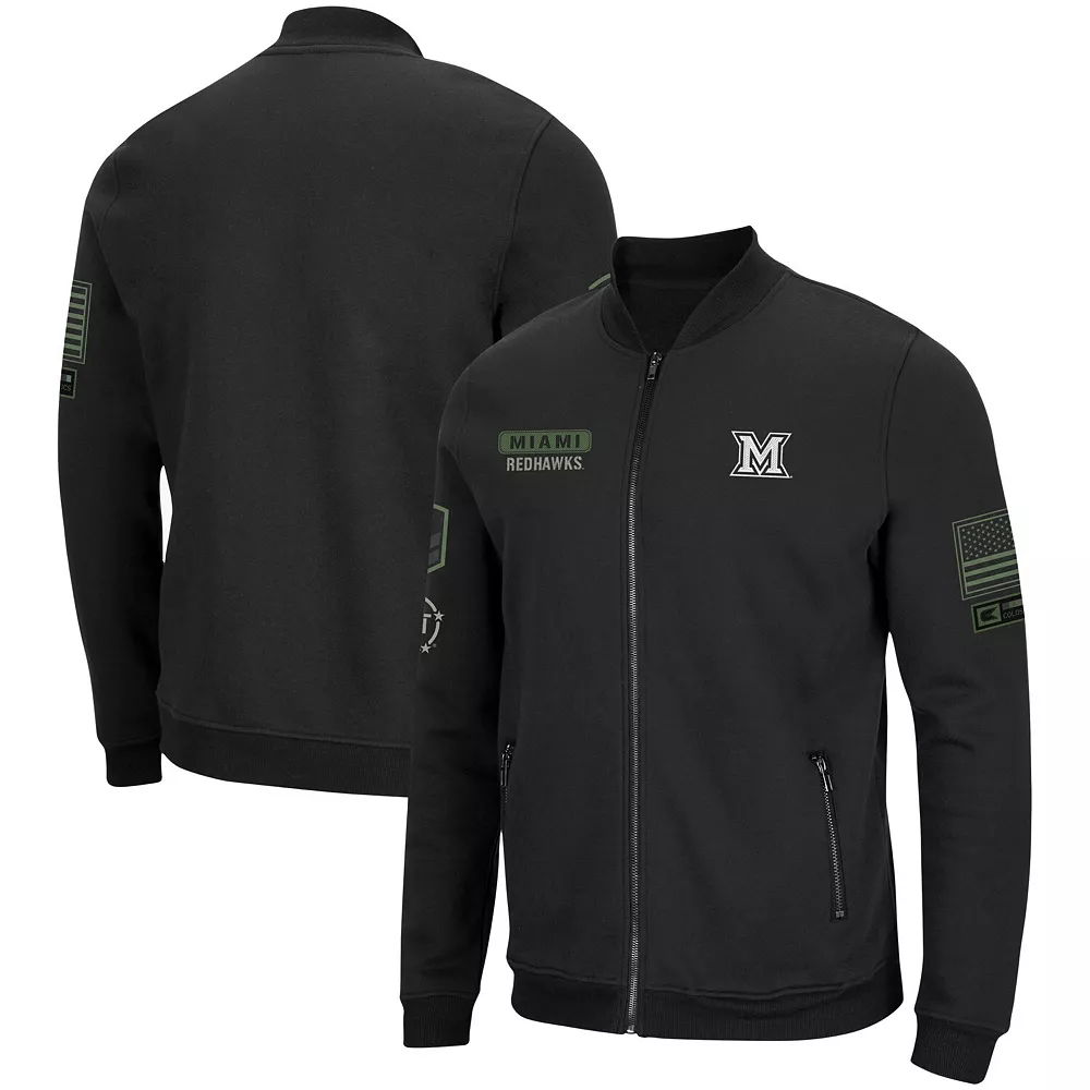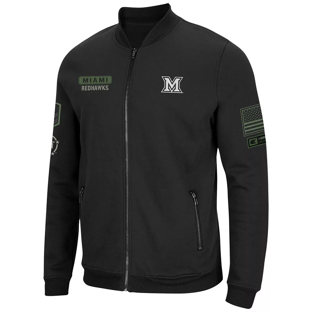 In cold weather, show your pride for the Miami University RedHawks and those who defend our country by wearing this High-Speed Bomber full-zip jacket from Colosseum. It features embroidered Miami University RedHawks graphics that match the OHT Military Appreciation appliques on each sleeve. Plus, fleece lining provides an extra layer of warmth and coziness.