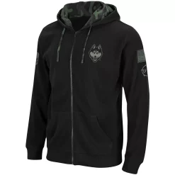 Elevate your UConn Huskies gear by grabbing this OHT Military Appreciation full-zip hoodie from Colosseum. It features embroidered UConn Huskies graphics that coordinate with the camo pattern on the drawstrings and hood lining. You’ll proudly represent your favorite collegiate squad when you put on this military-inspired outerwear.