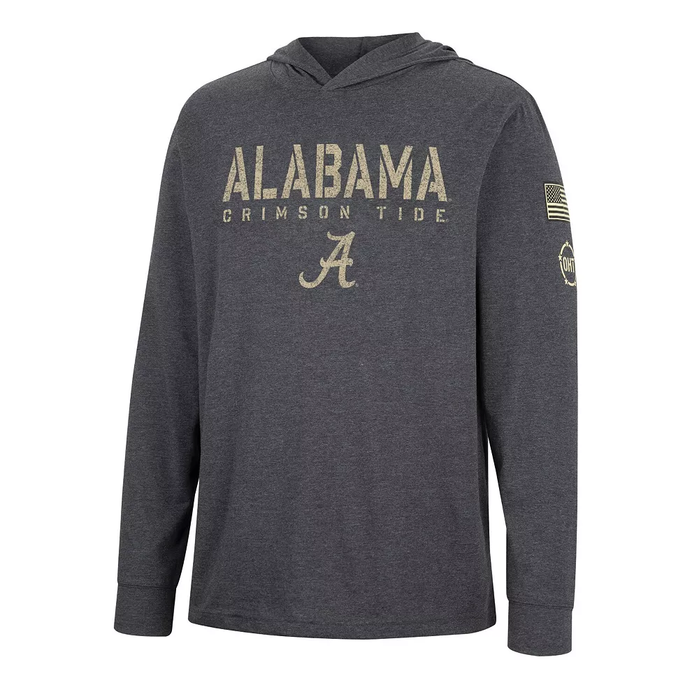 Represent the Alabama Crimson Tide in patriotic fashion with this Colosseum OHT hoodie T-shirt. Not only does it feature distressed team graphics across the front and back, but the embroidered American flag and Operation Hat Trick logo on the left sleeve allow you to give a big thank you to our military members. Showing your appreciation for those brave individuals and the Alabama Crimson Tide has never been easier than it is with this long sleeve tee.