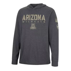 Represent the Arizona Wildcats in patriotic fashion with this Colosseum OHT hoodie T-shirt. Not only does it feature distressed team graphics across the front and back, but the embroidered American flag and Operation Hat Trick logo on the left sleeve allow you to give a big thank you to our military members. Showing your appreciation for those brave individuals and the Arizona Wildcats has never been easier than it is with this long sleeve tee.