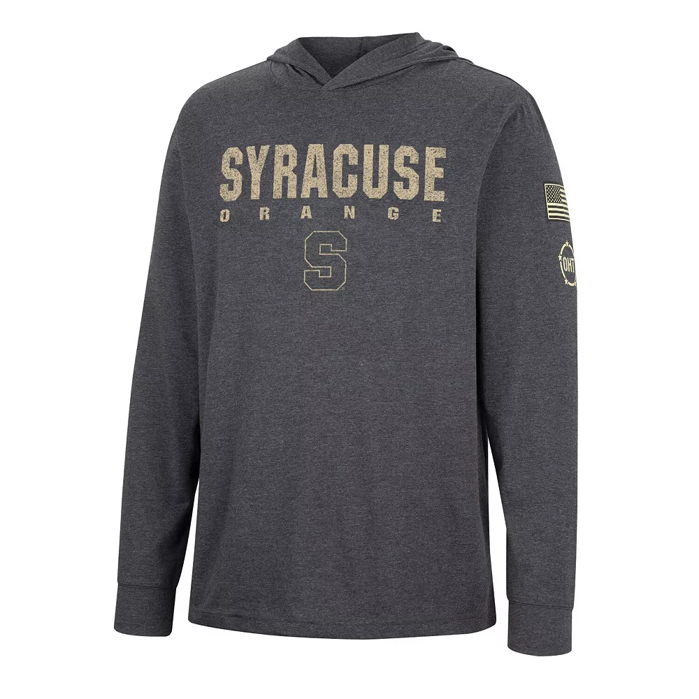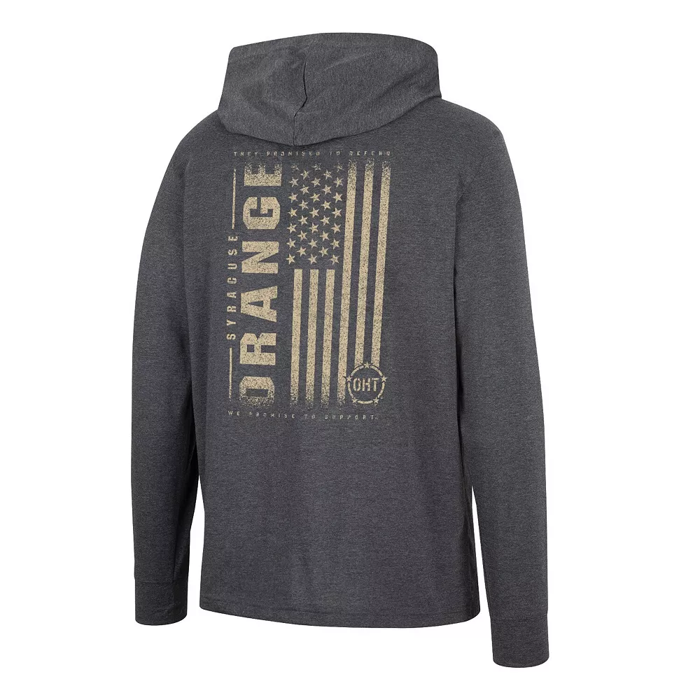 Represent the Syracuse Orange in patriotic fashion with this Colosseum OHT hoodie T-shirt. Not only does it feature distressed team graphics across the front and back, but the embroidered American flag and Operation Hat Trick logo on the left sleeve allow you to give a big thank you to our military members. Showing your appreciation for those brave individuals and the Syracuse Orange has never been easier than it is with this long sleeve tee.