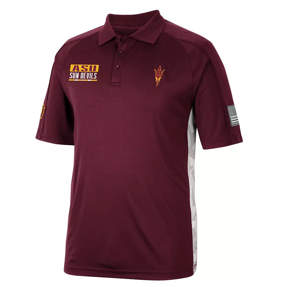 Support the Arizona State Sun Devils and a patriotic cause with this OHT Military Appreciation Snow Camo polo from Colosseum. It features striking team graphics on the front and an American flag applique on the left sleeve. The subtle snow camo pattern on the side gives this Arizona State Sun Devils polo a unique finish.