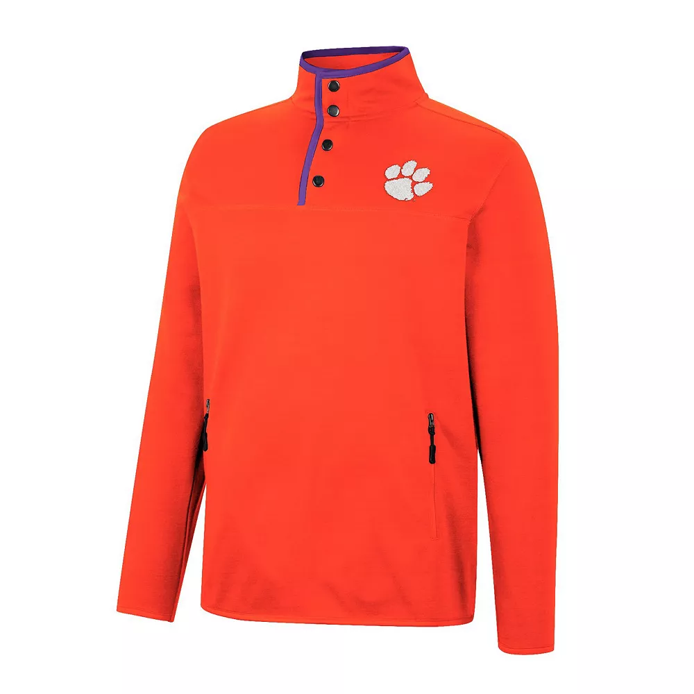 Show that colder temperatures are no match for your fiery passion for the Clemson Tigers when you layer up in this Rebound Snap jacket from Colosseum. This bold pullover features a distinct look thanks to its four-snap placket, as well as convenient storage due to its two front pockets. Plus, the fresh Clemson Tigers embroidery and vibrant colorway add flair to your chilly weather collection.