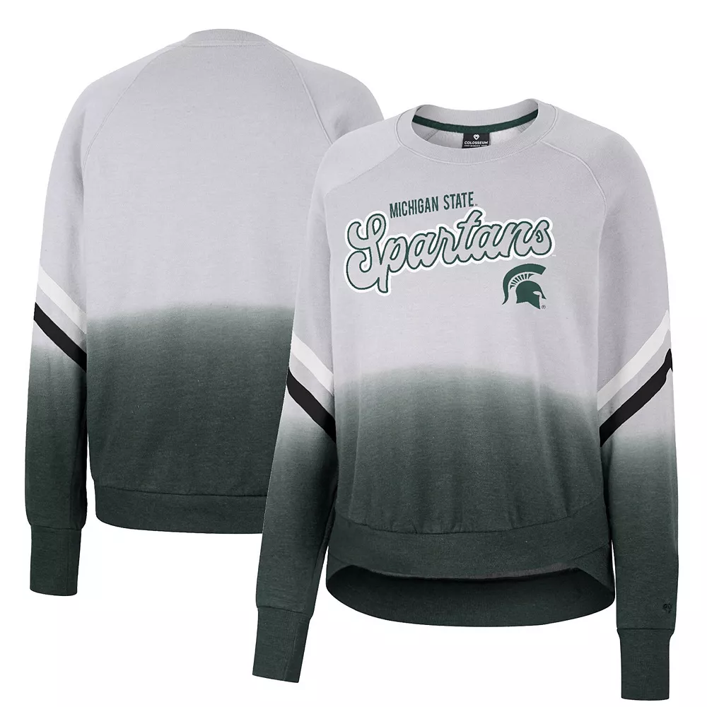 Upgrade your rotation of official Michigan State Spartans apparel with this Cue Cards pullover sweatshirt from Colosseum. It features a vibrant dip-dye design and contrast-color stripes on the sleeves, making it a unique option for game day. The raglan sleeves offer increased movement and comfortability for your arms and shoulders, which will come in handy when you are cheering the Michigan State Spartans on to victory.