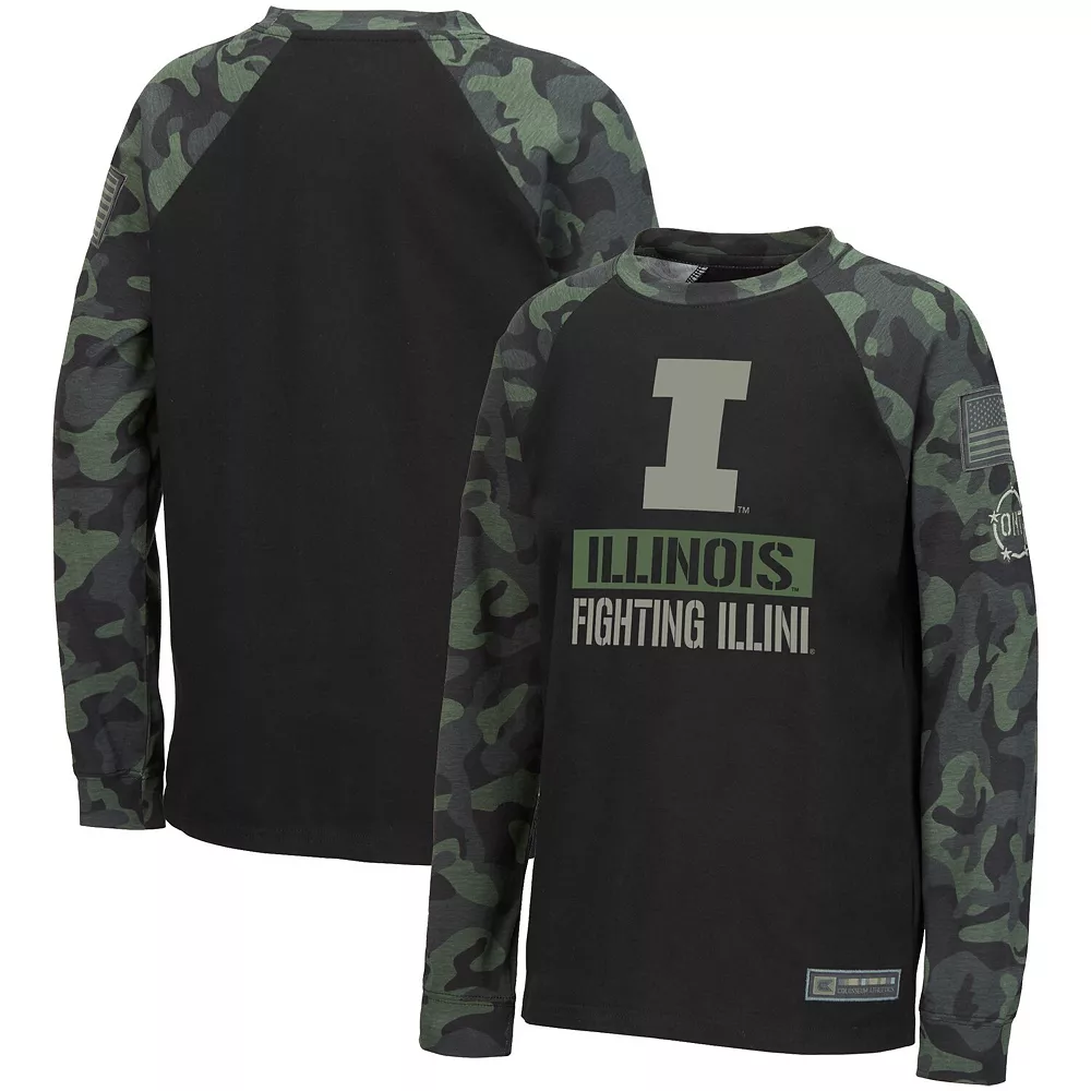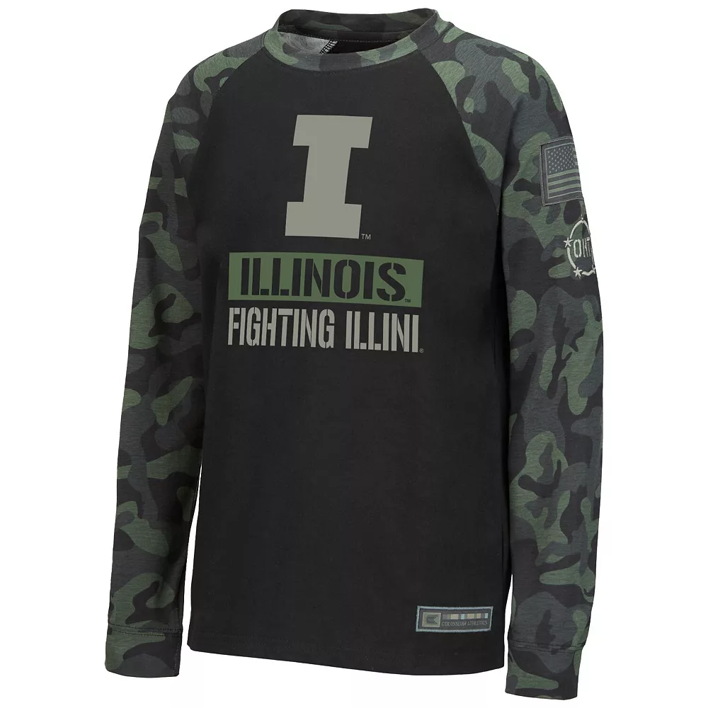 Encourage showing pride in the Illinois Fighting Illini and honoring service members by picking up this OHT Military Appreciation T-shirt from Colosseum. It features printed Illinois Fighting Illini graphics that coordinate with the camo print. Sporty raglan sleeves also provide a little extra room for more flexible movement.