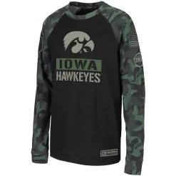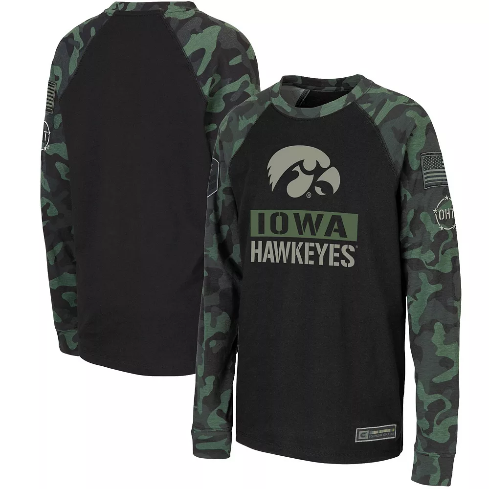Help encourage pride in the Iowa Hawkeyes and honoring service members with this OHT Military Appreciation T-shirt from Colosseum. It features printed Iowa Hawkeyes graphics that coordinate with the sporty raglan sleeves in a camo print. They’ll demonstrate support for more than just their favorite team in this warm tee.