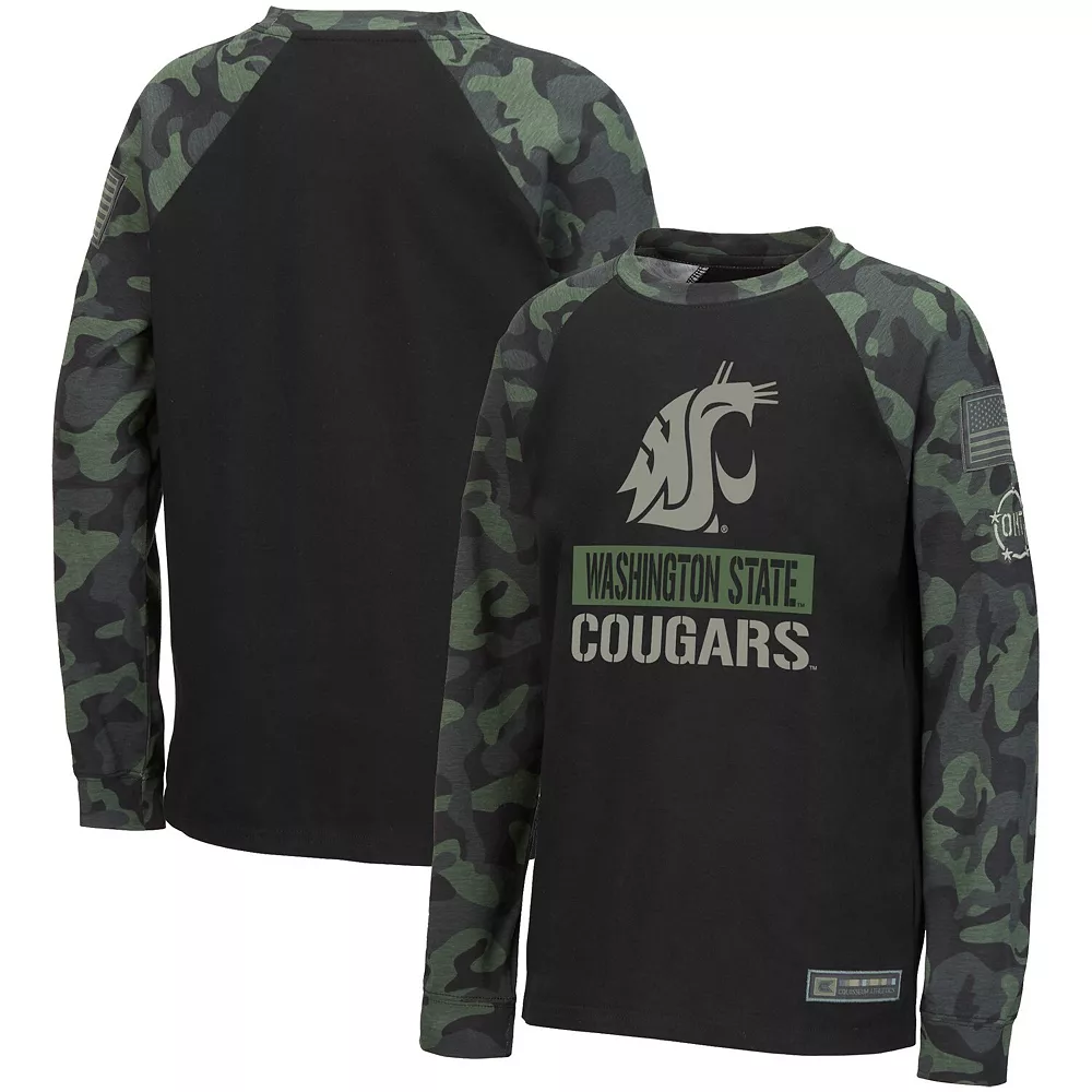 Encourage showing pride in the Washington State Cougars and honoring service members by picking up this OHT Military Appreciation T-shirt from Colosseum. It features printed Washington State Cougars graphics that coordinate with the camo print. Sporty raglan sleeves also provide a little extra room for more flexible movement.