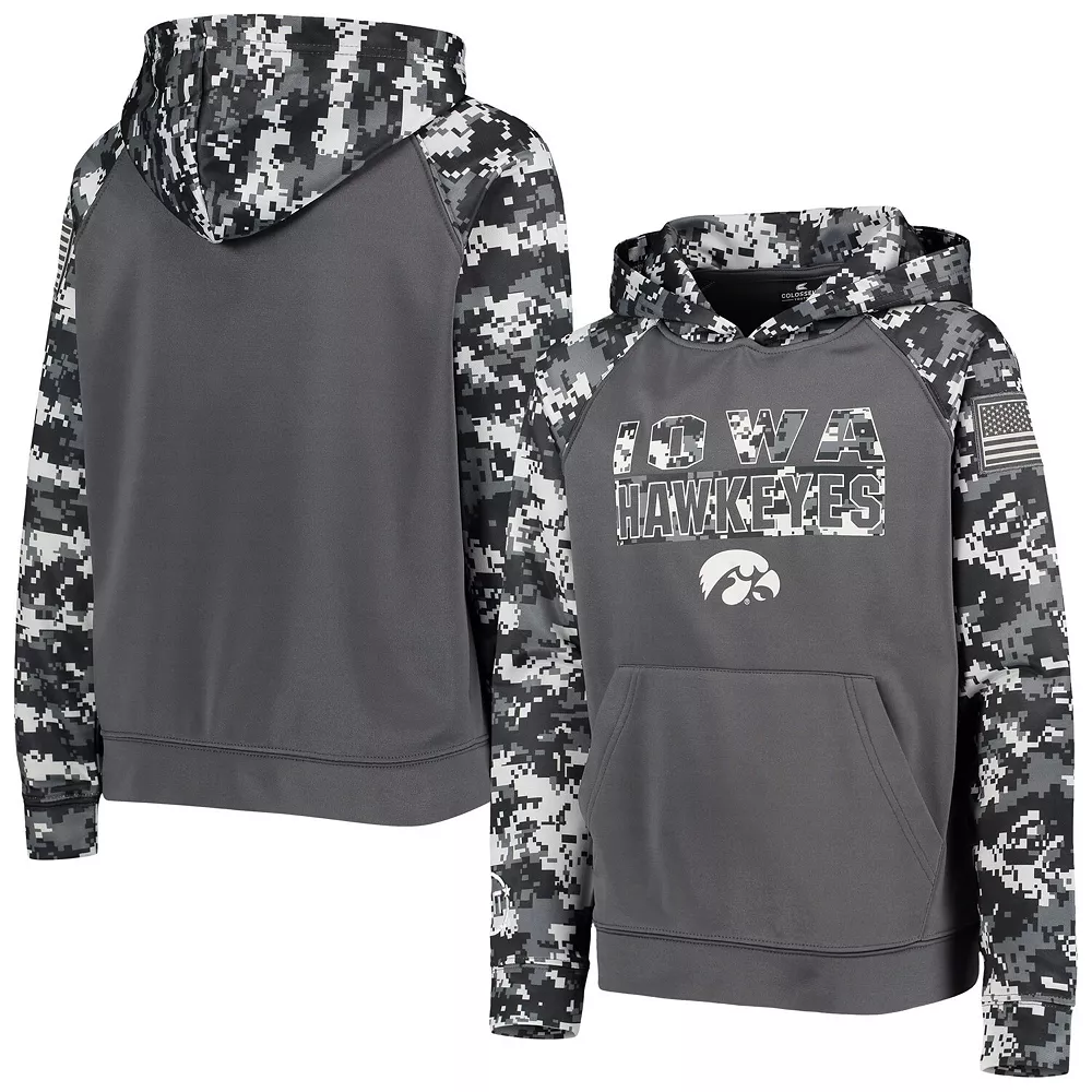Your young Iowa Hawkeyes fan loves to show their appreciation for veterans. Help your kiddo gear up with this OHT Military Appreciation Digital Camo raglan pullover hoodie from Colosseum. With a striking digital camo Iowa Hawkeyes logo, this hoodie will show off your youngster’s favorite team while keeping them warm.