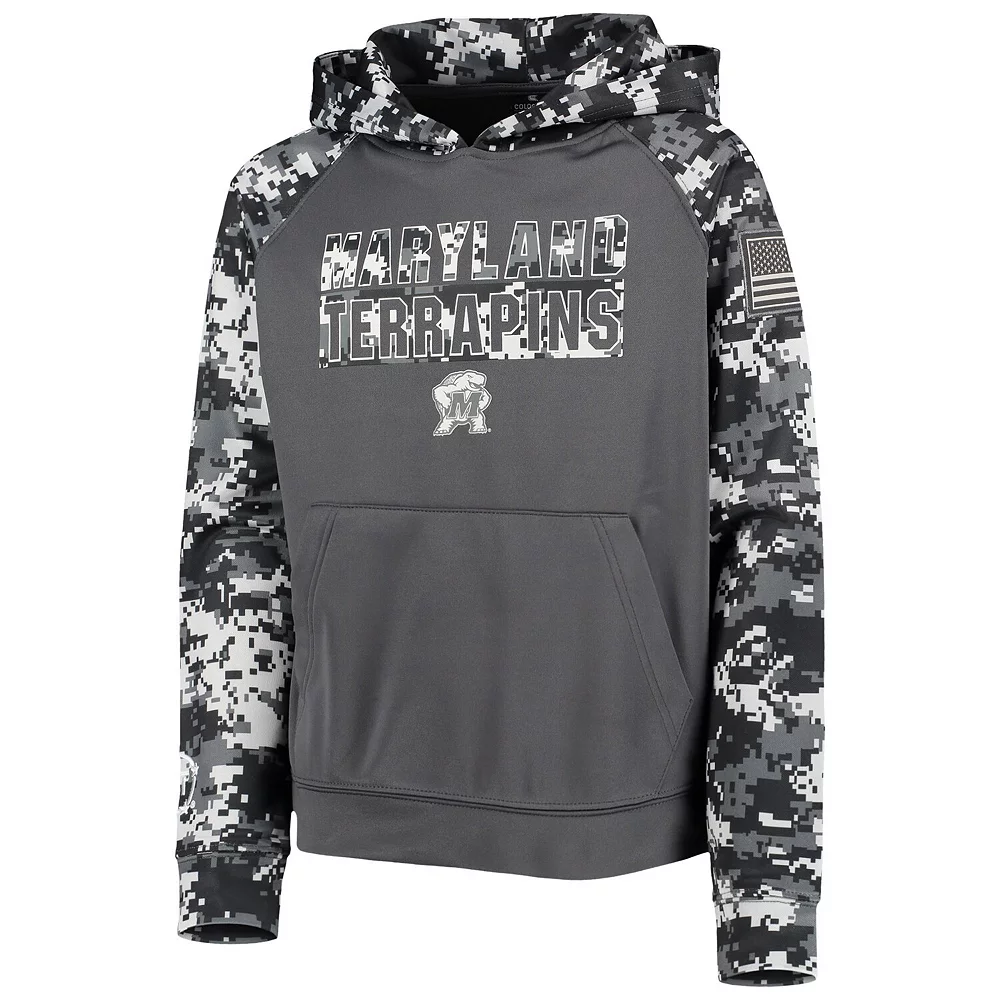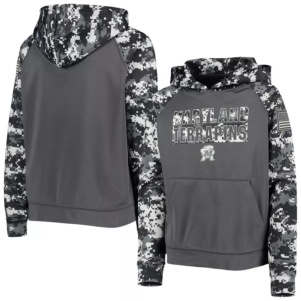 Your young Maryland Terrapins fan loves to show their appreciation for veterans. Help your kiddo gear up with this OHT Military Appreciation Digital Camo raglan pullover hoodie from Colosseum. With a striking digital camo Maryland Terrapins logo, this hoodie will show off your youngster’s favorite team while keeping them warm.