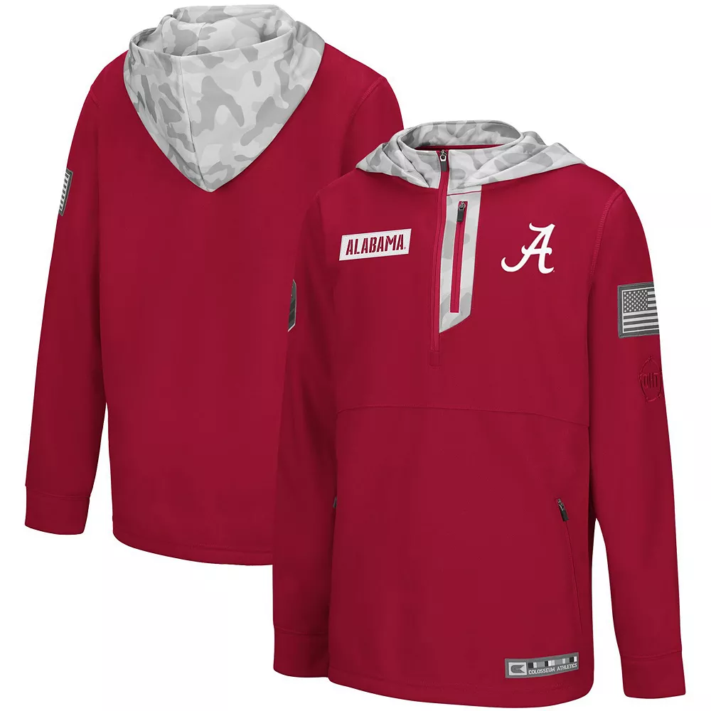 Encourage showing support for service members and veterans with this Alabama Crimson Tide Shellback quarter-zip hoodie from Colosseum. It features the Alabama Crimson Tide logo printed on the front, the OHT Military Appreciation emblem embroidered on the left sleeve with an American flag applique and a camo pattern on the hood. Plus, multiple zippered pockets keep items secure while on the move.