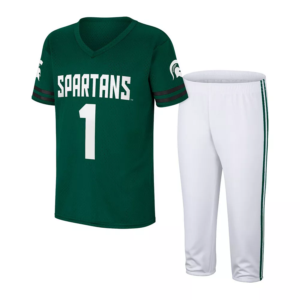 Gear up your future Michigan State Spartans player with this fun set from Colosseum. It features a breathable mesh jersey and pants based on the uniforms the football team wears on the field. Plus, the authentic Michigan State Spartans graphics help make any day game day a radical one.