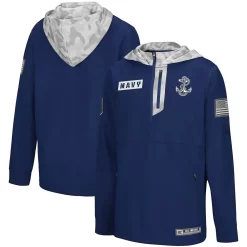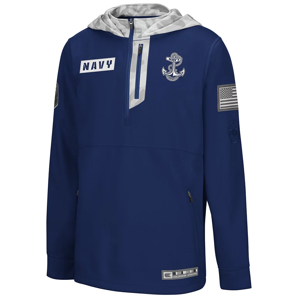 Encourage showing support for service members and veterans with this Navy Midshipmen Shellback quarter-zip hoodie from Colosseum. It features the Navy Midshipmen logo printed on the front, the OHT Military Appreciation emblem embroidered on the left sleeve with an American flag applique and a camo pattern on the hood. Plus, multiple zippered pockets keep items secure while on the move.