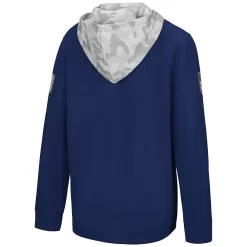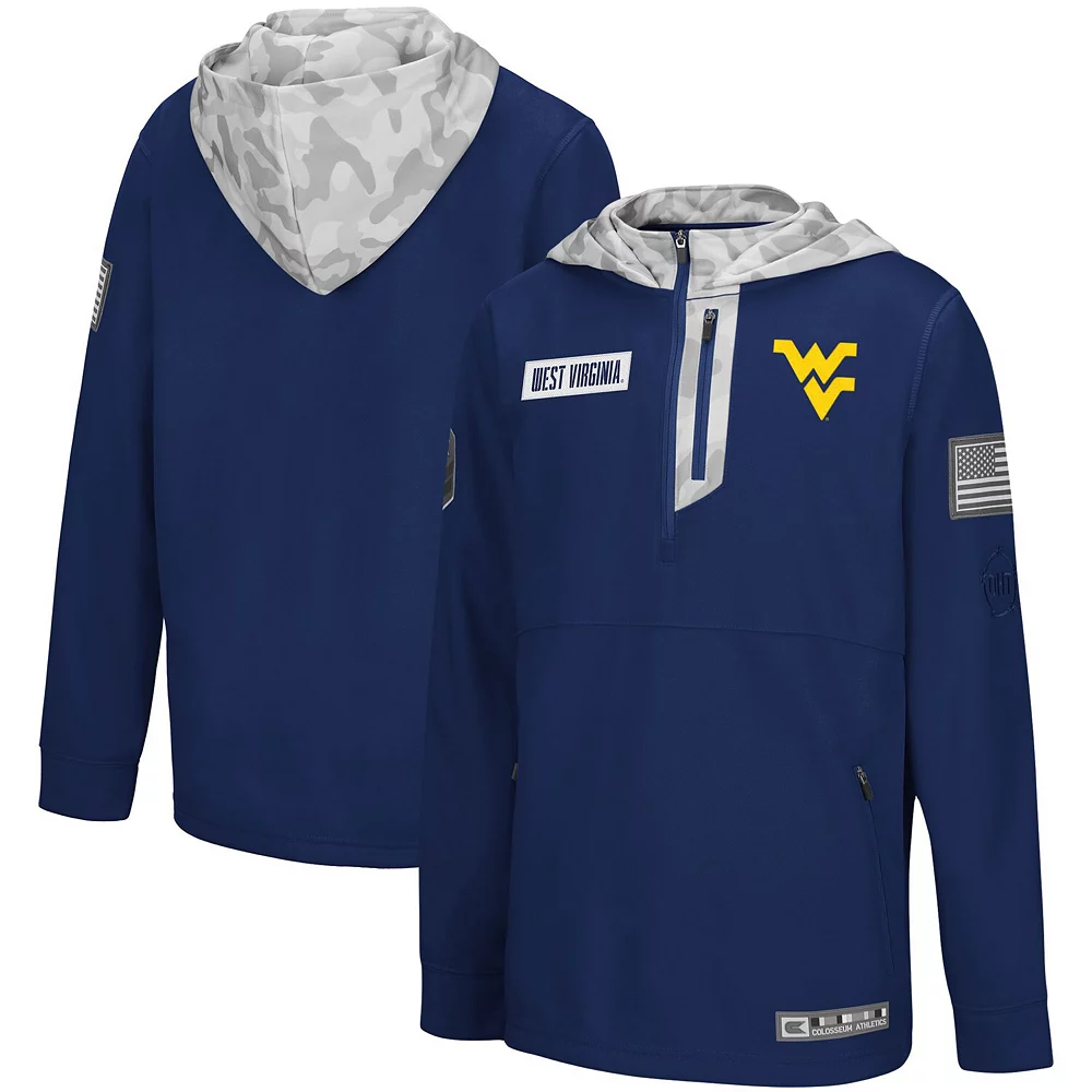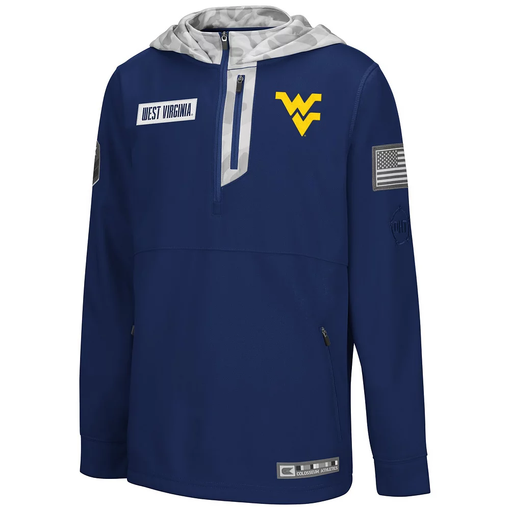 Encourage showing support for service members and veterans with this West Virginia Mountaineers Shellback quarter-zip hoodie from Colosseum. It features the West Virginia Mountaineers logo printed on the front, the OHT Military Appreciation emblem embroidered on the left sleeve with an American flag applique and a camo pattern on the hood. Plus, multiple zippered pockets keep items secure while on the move.